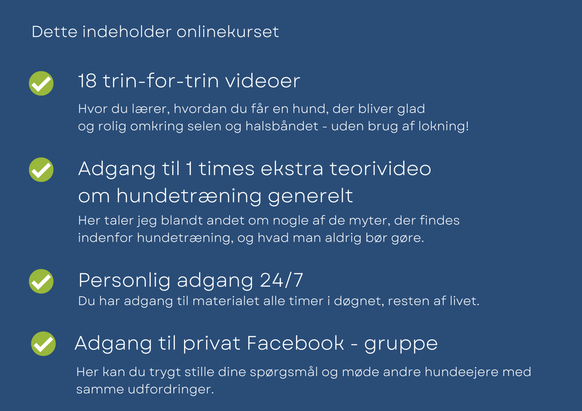 I onlinekurset fortæller jeg dig præcist, hvad du kan gøre for at ændre din hunds opfattelse af selen og ende med en hund, der slet ikke reagerer, så du i stedet kan nyde at skulle ud af døren med din hund.