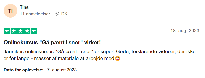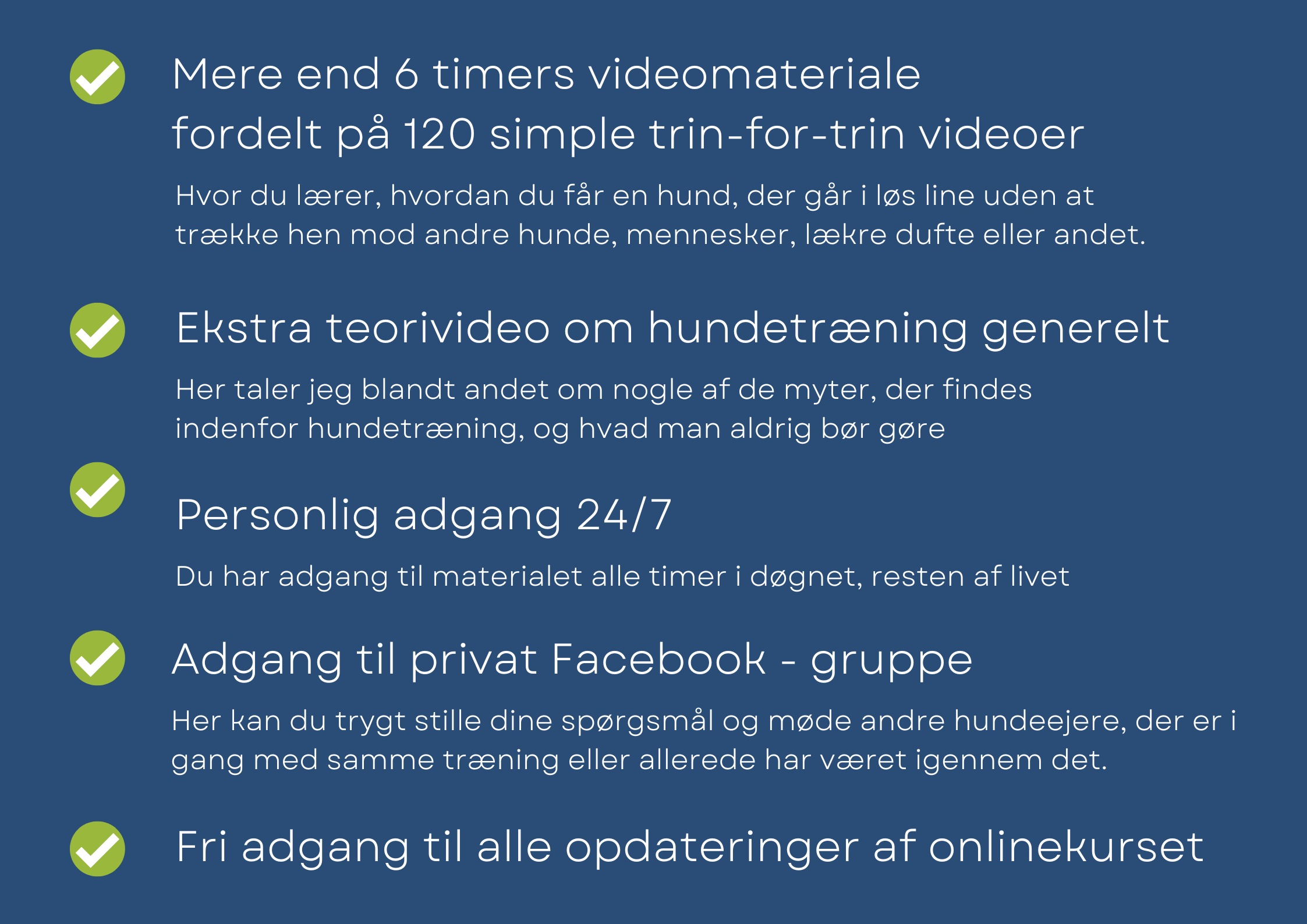 I dette onlinekursus har jeg videoer klar til dig hvor jeg med hjælp fra mine egne hunde, viser dig hvordan du får en hund, der altid går i løs line.