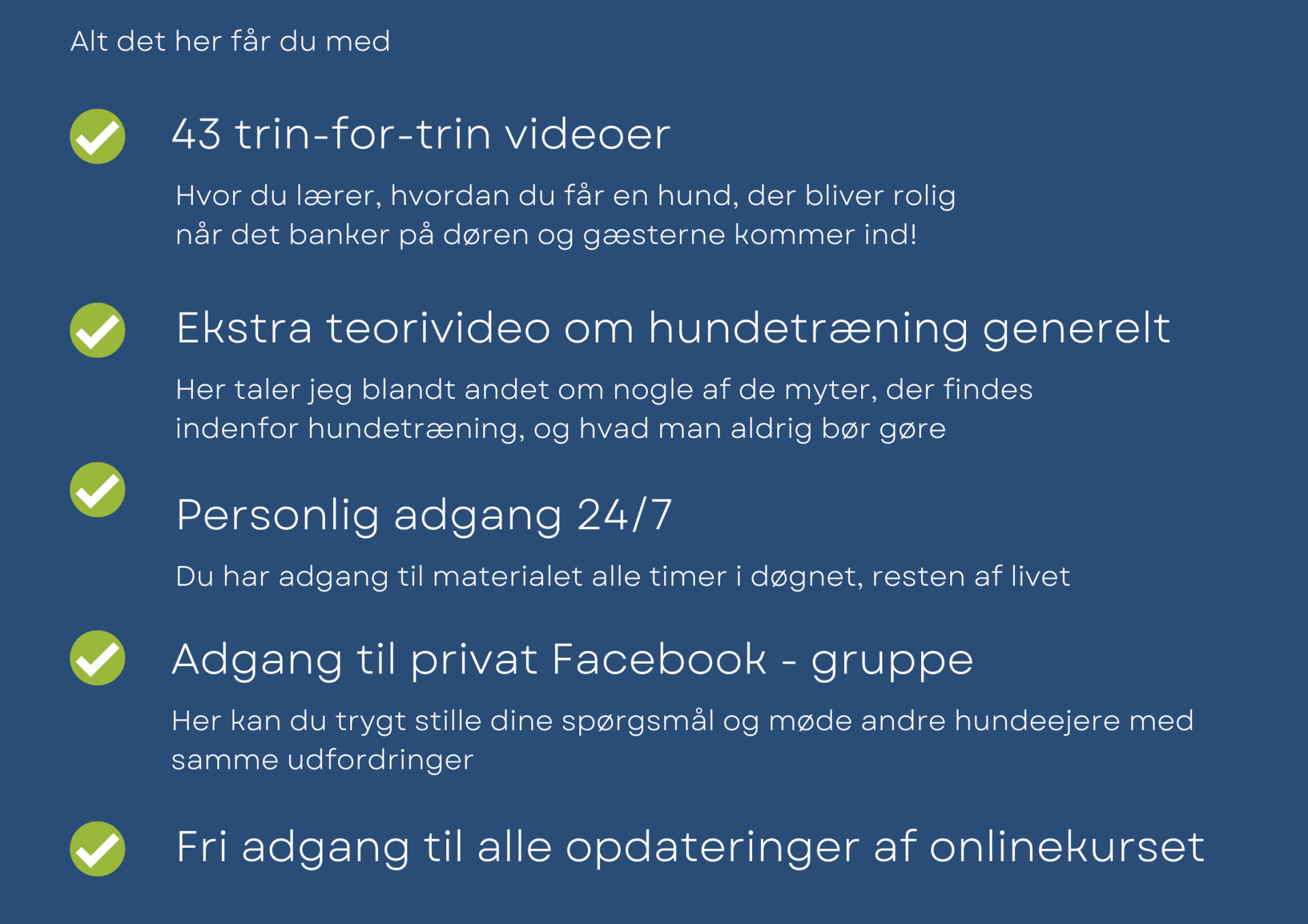 Jeg elsker at lære fra mig, så derfor får du også nogle bonusvideoer, hvor jeg viser dig, hvordan du træner ro i hjemmet, så du kan få en meget mere rolig hund generelt. Jeg lærer dig hvordan du får en hund som elsker at ligge i sin hundekurv, hundetæppe eller et andet sted du foretrækker.
