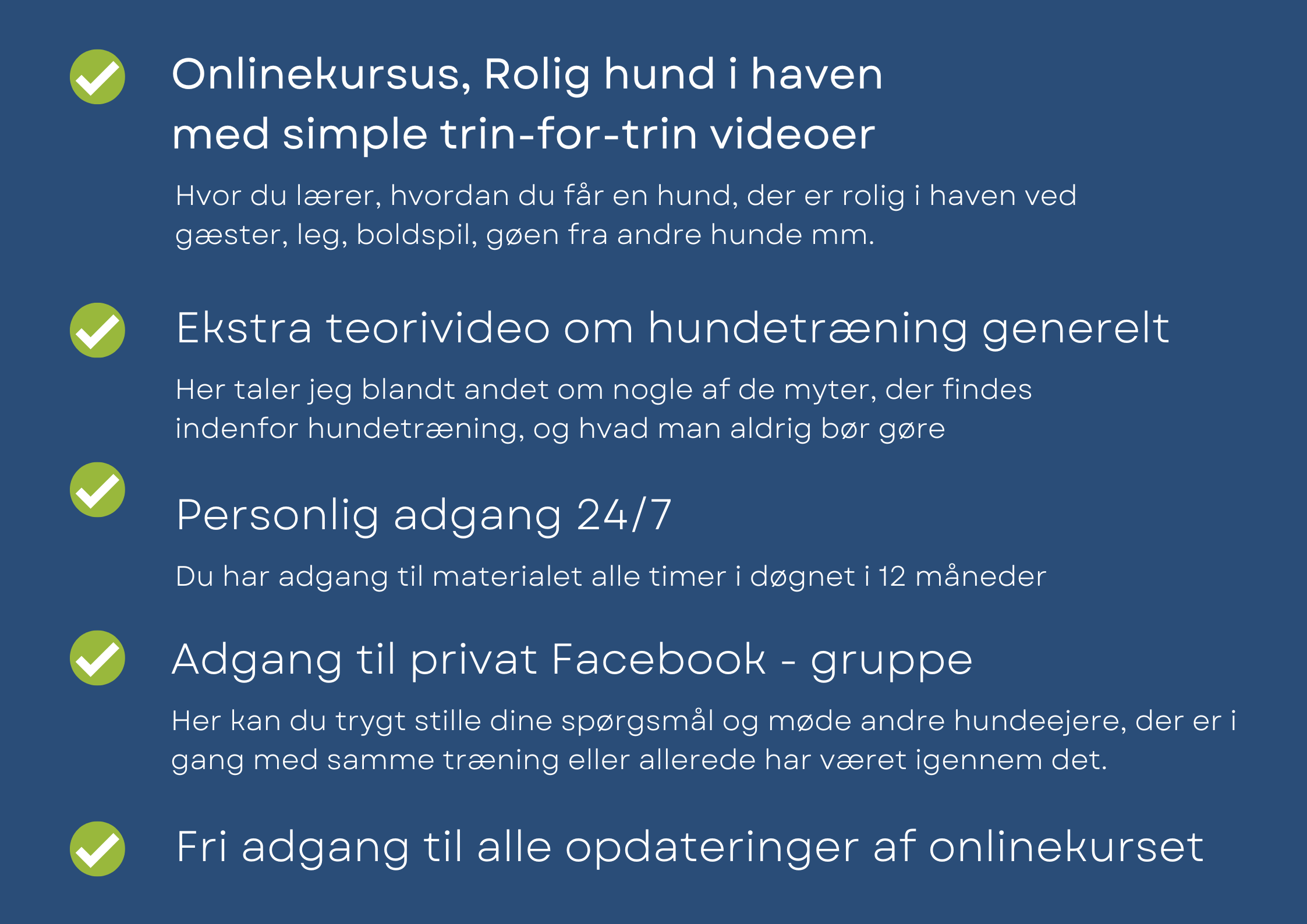 Du får den vigtigste teori og de bedste øvelser, og jeg tager dig i hånden med det samme, så du med sikkerhed kan få en hund, der bliver rolig i haven.