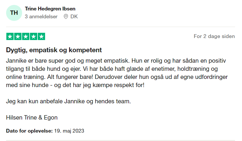 Hundetræning hos mig handler primært om den gode relation mellem hunde og mennesker. Jeg har fokus på leg og ro i træningen, da jeg mener, den bedste træning bygger på sjov og glæde.